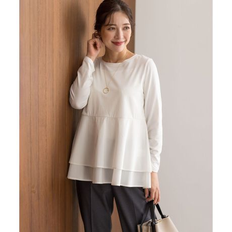 ■デザイン・裾をシャツ地の2重のフレアティアードで切り替えたロングTシャツです。・適度な薄さで1枚でも着用できる素材を使用。ニットやカーディガンのレイヤードにも便利なアイテムで、ロングシーズンお使いいただけます。・袖口に長めのシャーリングディテールを入れることで、レディライクな印象になるよう仕上げています。
