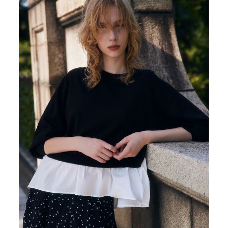 【スタッフコメント】▼身長158cm|着用サイズ2 (通常着用サイズM)レイヤード風なのでこれ1枚で決まるプルオーバーです。身体のラインを拾い過ぎないサイズ感で体型を気にせず着用いただけます。身体から離れたシルエットでまだ暑い初秋でも即着可能な優れもの!