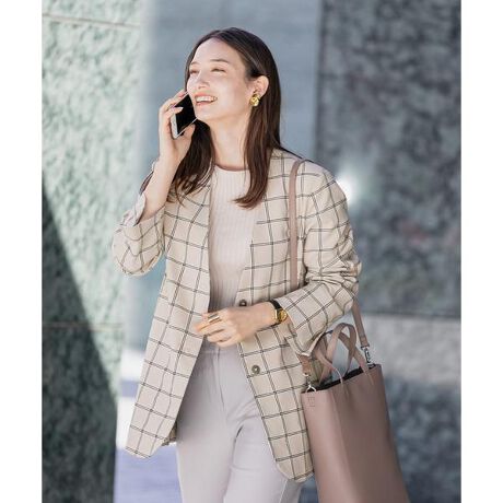 チェック柄の存在感のあるジャケットが登場。ノーカラーでスッキリと着用できる絶妙なサイズ感に仕立てました。袖口を折り返しても綺麗に着てただけます。同素材の【AA04-24C015 チェックワイドパンツ】とセットアップでの着用もおすすめです!