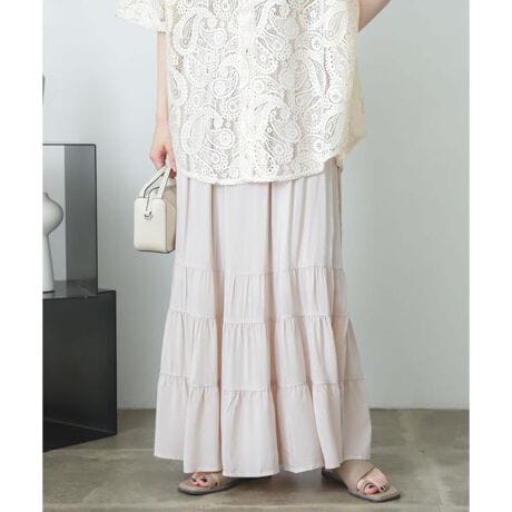 ○ウエストゴムで楽に着用でき、腰回りはスッキリとさせ、裾のボリュームにポイントをおいたティアードデザイン