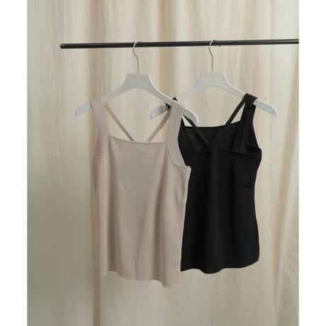 後ろがダブルストラップ、クロスデザインになっているニットタンクトップ。シアーシャツやメッシュトップなどのインナーとしてもデザインが映えるようにしています。
