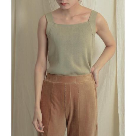 後ろがダブルストラップ、クロスデザインになっているニットタンクトップ。シアーシャツやメッシュトップなどのインナーとしてもデザインが映えるようにしています。