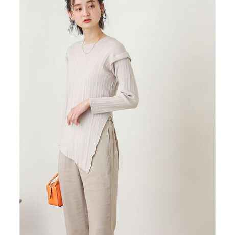 肩にタックを施し、肩のデザインがモードな印象のニットプルオーバーです。裾に入ったアシンメトリーなスリットがおしゃれな雰囲気に。程よくフィットするリブが女性らしさを演出。1枚で存在感抜群のアイテムです。明るめなカラー展開がコーディネートに彩りを与えてくれます。シンプルな丸首リブニットは色違いで持っていたいアイテム。