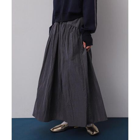 ナイロン系の柔らかい素材でギャザーを寄せたスカート。コンパクトなトップスやレザーのジャケットをばさっと羽織ったスタイルがおすすめです。前後で高さを変えカーブした切替を入れることでスタイルアップが叶います。
