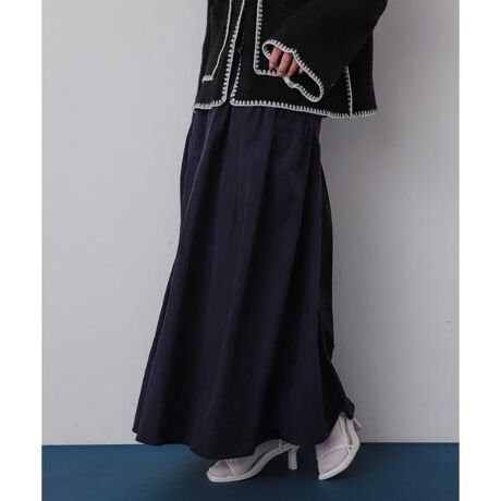 ナイロン系の柔らかい素材でギャザーを寄せたスカート。コンパクトなトップスやレザーのジャケットをばさっと羽織ったスタイルがおすすめです。前後で高さを変えカーブした切替を入れることでスタイルアップが叶います。
