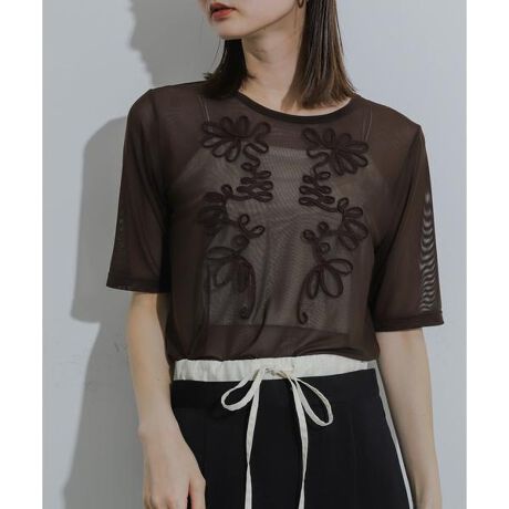 トップスとしてもインナー使いもしやすいメッシュトップス。コード刺繍が目を引くデザインなのでデニムやスラックスなどシンプルなコーディネートでも華があります。秋に向けてジャケットやジレなど前開きの羽織との合わせもおすすめです。