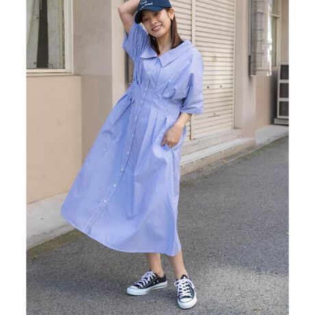 一着で完結できるワンピースです。パンツにキャミなどのインナーを合わせて、前を開けて羽織り風にきてもウエストがくびれて見えスタイルUP効果が高いので、おすすめコーディネートです。
