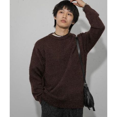 毛足の長いウォーミーな糸で編み立てたクルーネックニット