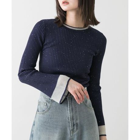 きらっとスパンコールが華やぐセーター、シンプルなデザインながら一枚でもインナーにも用途使い抜群!袖にかけて広がるフレアのシルエットはラインを綺麗に魅せてくれます◎