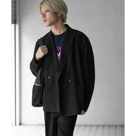 〇カジュアル仕立てなダブル型のジャケットでほどよい抜けのあるスタイルに