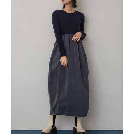 ニットと布帛の異素材ドッキングのこちらのワンピース、スカートは布帛素材で落ち感があるのでニット特有の着ぶくれ感もなく、ウエスト切り替えでスッキリ見え◎裏地もついてるので透ける心配もなく、コクーンのシルエットでトレンド感を拾いつつニットはシンプルな形なので一枚でさらっとお洒落に着用できます!ブーツ合わせや、アウターはロングでもショートでもどちらでも合わせやすいアイテムです!