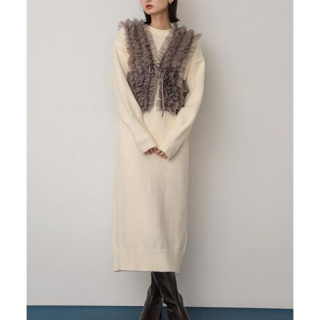 やわらかいニット素材のハイネックワンピース、寒い季節でも首回りが暖かくリラックスな着心地でありながら、取り外し可能のチュールベストがワンピースを彩ってくれる一枚です◎ブーツ合わせがおすすめですが、スニーカー合わせでカジュアルダウンに落とし込むのも◎