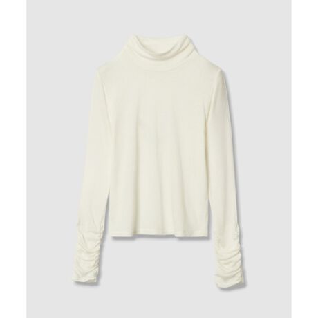 襟ぐりと袖口はギャザーが入っておりロングスリーブのトップスとレイヤードした際にもちらっと見えるのがポイント
