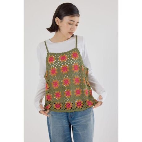 ■ポイントカラーが目を惹くクロシェキャミソール。カジュアルながらも女性らしい印象を与えてくれます。■ディテール丈感は短すぎず長すぎずで、インナーやボトムを選ぶことなく、コーディネートに取り入れていただけます。かぎ針刺繍です。ショルダーの紐で着丈の調節可能です。■スタイリング無地のTシャツにデニムといったベーシックなスタイリングにも、プラスワンするだけでこなれ感を演出してくれます。■生地※手洗い可能商品。※鈎針刺しゅうの商品ですので、つなぎの結び目があったり、横に糸が通っていたりなど、1点1点見え方に個体差は生じます。生産工程上、致し方ありませんので、ご了承ください。伸縮性の強い商品のため、ハンガーに掛けた状態で保管すると、襟元などが伸びる場合がございます。平置きでの保管をおすすめいたします。かぎ針風の編地ですので、引っ掛かりやすい編地になります。取り扱いは丁寧に、十分にご注意ください。■透け感:あり■裏地:なし■伸縮性:ややあり■光沢感:なし[注意事項]※画像の商品はサンプルです。実際の商品と仕様、加工が若干異なる場合があります。※画像の商品は光の照射や角度、お使いのモニター環境により、実物と色味が異なる場合がございます。※着用、お取り扱いの際は、アテンションタグをご確認ください。