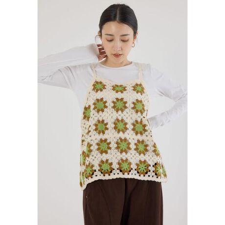■ポイントカラーが目を惹くクロシェキャミソール。カジュアルながらも女性らしい印象を与えてくれます。■ディテール丈感は短すぎず長すぎずで、インナーやボトムを選ぶことなく、コーディネートに取り入れていただけます。かぎ針刺繍です。ショルダーの紐で着丈の調節可能です。■スタイリング無地のTシャツにデニムといったベーシックなスタイリングにも、プラスワンするだけでこなれ感を演出してくれます。■生地※手洗い可能商品。※鈎針刺しゅうの商品ですので、つなぎの結び目があったり、横に糸が通っていたりなど、1点1点見え方に個体差は生じます。生産工程上、致し方ありませんので、ご了承ください。伸縮性の強い商品のため、ハンガーに掛けた状態で保管すると、襟元などが伸びる場合がございます。平置きでの保管をおすすめいたします。かぎ針風の編地ですので、引っ掛かりやすい編地になります。取り扱いは丁寧に、十分にご注意ください。■透け感:あり■裏地:なし■伸縮性:ややあり■光沢感:なし[注意事項]※画像の商品はサンプルです。実際の商品と仕様、加工が若干異なる場合があります。※画像の商品は光の照射や角度、お使いのモニター環境により、実物と色味が異なる場合がございます。※着用、お取り扱いの際は、アテンションタグをご確認ください。