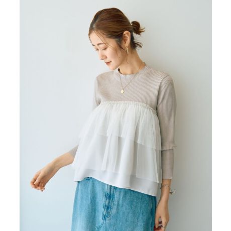 ライトなリブニットにシフォン生地をドッキングし、チュールラッフルを重ねたフェミニンなデザインです。