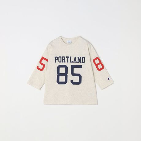 胸元にはカレッジ風フォントを使用したアメリカの地名とナンバリングを組み合わせたグラフィックをプリントし、袖にも同じナンバーをラバープリントで表現しています。