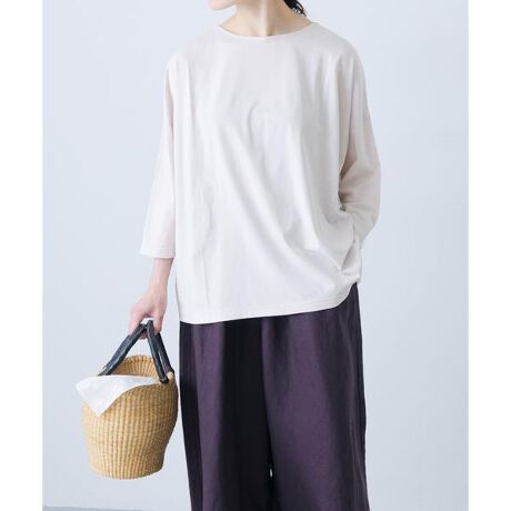 カジュアルな印象のカットソーも、生地感で差をつければこなれたムードに。そんな大人のコーディネートに活躍するアイテムが届きました。素材はインドで手摘みされた高品質な超長綿。毛羽がそぎ落とされたクリアな表面が特徴の強撚糸を使用しています。着用や洗濯を繰り返しても毛羽立ちが少なく、風合いが長持ちするのも嬉しいポイント。ワイドシルエットでストレスの無いサイズ感に仕上げました。ゆるめの7分袖は風通しが良く、今から秋口まで長く着まわせそうです。