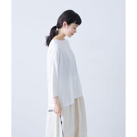 カジュアルな印象のカットソーも、生地感で差をつければこなれたムードに。そんな大人のコーディネートに活躍するアイテムが届きました。素材はインドで手摘みされた高品質な超長綿。毛羽がそぎ落とされたクリアな表面が特徴の強撚糸を使用しています。着用や洗濯を繰り返しても毛羽立ちが少なく、風合いが長持ちするのも嬉しいポイント。ワイドシルエットでストレスの無いサイズ感に仕上げました。ゆるめの7分袖は風通しが良く、今から秋口まで長く着まわせそうです。