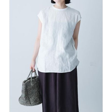 肩にかかるフレンチスリーブは程よく二の腕をカバーし、涼しい着心地を叶えます。シンプルですが首元が詰まった上品なデザインと後ろのタックがポイント◎パンツはもちろんサロペットにも相性が良く、タックインしてスカートにも合わせていただけます。生地はハリのあるしなやかな素材感のハードマンズリネンを使用。フランスのノルマンディ地方で収穫されたリネンの原料を伝統ある紡績方法で紡ぎ、織りあげています。爽やかなOFF、馴染みのいいLIGHT BLUE、合わせやすいNAVYの3色展開です。