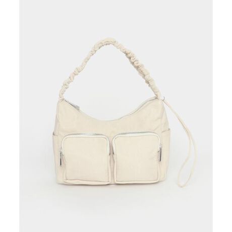 カジュアルな印象のナイロン素材ですが、ギャザーデザインがあることで、モードな印象などのコーディネートにも合うデザイン。