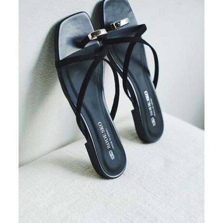 アッパーは足にしっかりフィットするクロスデザイン。高級感のあるスエード調素材を使用し、足元に程よい抜け感をプラスしてくれます。メタルパーツがアクセントになっており、シンプルながらも上品で華やかな印象に。フラットソールで歩きやすく、デイリーにもリゾートにも活躍する万能サンダルです。