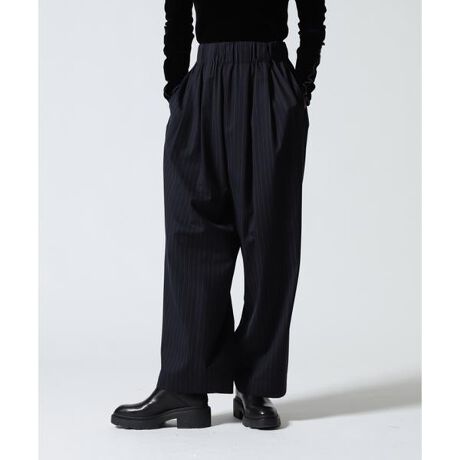 太幅ゴムがモードなワイドイージーパンツ。上品なピンストライプ生地を採用し、すっきり見えする計算されたワイドシルエット。