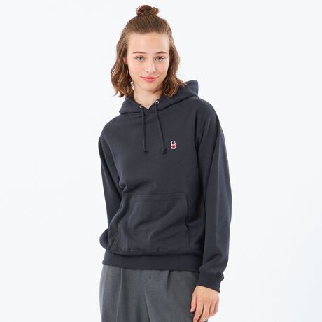 胸元のワッペンがアクセントのプルオーバーパーカー。普段使いのコーディネートに合わせやすいプレーンなデザインです。