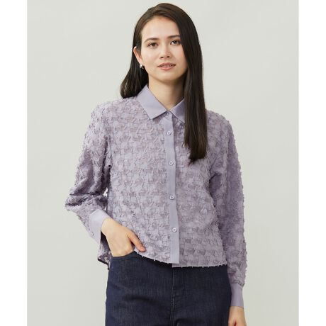 華やかなカットジャカード素材でコーディネートが決まるブラウス■デザイン身頃と袖部分に華やかなカットジャカード素材を使用した、トレンドのクロップド丈ブラウスです。襟とカフス、前立てに使用した同色の無地生地とジャカード素材が、程よく素材コントラストを効かせたデザイン性の高い1着です。エレガント過ぎないデイリーに着まわせる幾何柄のカットジャカードで、シンプルなボトムに合わせるだけで華やかなコーディネートが完成します。少し前後差のある着丈なので、クロップド丈でありながらも腰回りを程よくカバーするバランス感で、ワイドパンツやスカートなどボリュームのあるボトムと好相性です。■素材ジャカード素材は、タテ糸に細番手のナイロン、ヨコ糸に綿キュプラを使用しております。ナイロンの透け感、光沢感と綿糸のナチュラル感、マットな素材感のコントラストが印象的な素材です。たっぷりと毛足の出た表情で、幾何柄でありながら華やかな印象になっています。無地部分は、タテ糸にアセテートとレーヨン、ヨコ糸にオーガニックコットンを使用したサスティナブル素材です。薄地でありながらも繊細なシャンブレーで表現されたカラーが奥行きを感じられリッチな印象になっています。しなやかで涼し気なタッチと、適度なツヤが上品で、大人っぽい素材です。無地部分タテ糸のアセテートはFSC認証、ヨコ糸のオーガニックコットンはGOTS認証を取得しています。■同素材アイテムプルオーバーブラウス(BLWMGW0309)