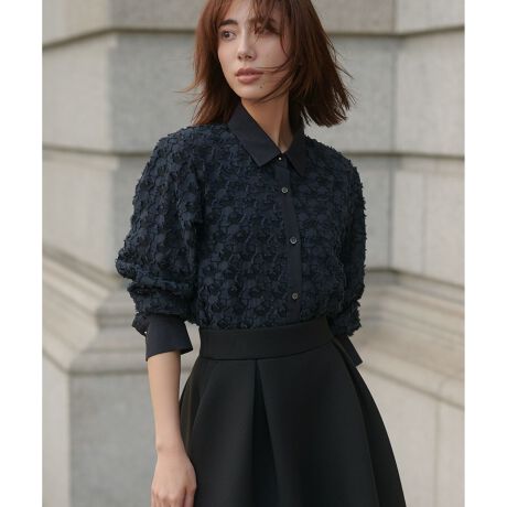 華やかなカットジャカード素材でコーディネートが決まるブラウス■デザイン身頃と袖部分に華やかなカットジャカード素材を使用した、トレンドのクロップド丈ブラウスです。襟とカフス、前立てに使用した同色の無地生地とジャカード素材が、程よく素材コントラストを効かせたデザイン性の高い1着です。エレガント過ぎないデイリーに着まわせる幾何柄のカットジャカードで、シンプルなボトムに合わせるだけで華やかなコーディネートが完成します。少し前後差のある着丈なので、クロップド丈でありながらも腰回りを程よくカバーするバランス感で、ワイドパンツやスカートなどボリュームのあるボトムと好相性です。■素材ジャカード素材は、タテ糸に細番手のナイロン、ヨコ糸に綿キュプラを使用しております。ナイロンの透け感、光沢感と綿糸のナチュラル感、マットな素材感のコントラストが印象的な素材です。たっぷりと毛足の出た表情で、幾何柄でありながら華やかな印象になっています。無地部分は、タテ糸にアセテートとレーヨン、ヨコ糸にオーガニックコットンを使用したサスティナブル素材です。薄地でありながらも繊細なシャンブレーで表現されたカラーが奥行きを感じられリッチな印象になっています。しなやかで涼し気なタッチと、適度なツヤが上品で、大人っぽい素材です。無地部分タテ糸のアセテートはFSC認証、ヨコ糸のオーガニックコットンはGOTS認証を取得しています。■同素材アイテムプルオーバーブラウス(BLWRGW0309)