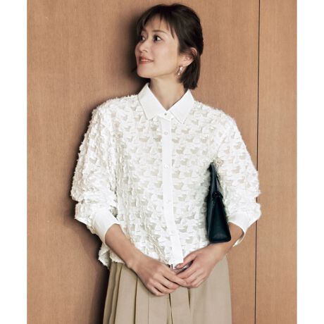 華やかなカットジャカード素材でコーディネートが決まるブラウス■デザイン身頃と袖部分に華やかなカットジャカード素材を使用した、トレンドのクロップド丈ブラウスです。襟とカフス、前立てに使用した同色の無地生地とジャカード素材が、程よく素材コントラストを効かせたデザイン性の高い1着です。エレガント過ぎないデイリーに着まわせる幾何柄のカットジャカードで、シンプルなボトムに合わせるだけで華やかなコーディネートが完成します。少し前後差のある着丈なので、クロップド丈でありながらも腰回りを程よくカバーするバランス感で、ワイドパンツやスカートなどボリュームのあるボトムと好相性です。■素材ジャカード素材は、タテ糸に細番手のナイロン、ヨコ糸に綿キュプラを使用しております。ナイロンの透け感、光沢感と綿糸のナチュラル感、マットな素材感のコントラストが印象的な素材です。たっぷりと毛足の出た表情で、幾何柄でありながら華やかな印象になっています。無地部分は、タテ糸にアセテートとレーヨン、ヨコ糸にオーガニックコットンを使用したサスティナブル素材です。薄地でありながらも繊細なシャンブレーで表現されたカラーが奥行きを感じられリッチな印象になっています。しなやかで涼し気なタッチと、適度なツヤが上品で、大人っぽい素材です。無地部分タテ糸のアセテートはFSC認証、ヨコ糸のオーガニックコットンはGOTS認証を取得しています。■同素材アイテムプルオーバーブラウス(BLW7GW0309)