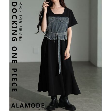 マルイウェブチャネル   /   サワアラモード   /   ワンピースドレス   /   ワンピース   /   【ワンピース】 ブラック 黒 半袖 ロング丈 ドッキング デニム フレア 綿 コットン ビスチェ風