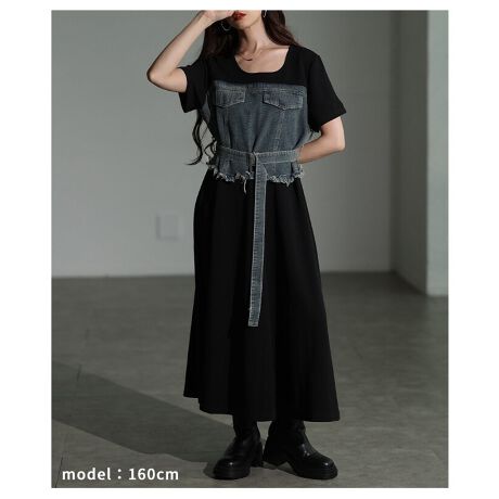 【ワンピース】 ブラック 黒 半袖 ロング丈 ドッキング デニム フレア 綿 コットン ビスチェ風
