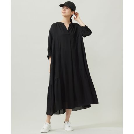 ギャザーディテールや素材の陰影が華やかなティアードワンピース■デザイン前身頃のヨークと後ろ襟ぐりにたっぷりとギャザーを寄せ、裾で切り替えたティアードディテールがポイントのワンピースです。ドラマチックなボリューム感とシアー素材の重なりが繊細な奥行を感じられる程よく華やかなワンピースになっています。シャープなキーネックなのでお顔周りはすっきりとした印象です。ボディラインを拾いにくいボリューム感がありながらもフロントに大きく取ったタックが縦のラインを強調し、落ち感のある素材を使用することで広がり過ぎないシルエットになっています。歩くたびに揺れる裾が女性らしく華やかな印象です。■素材タテ糸にポリエステル、ヨコ糸に再生繊維(セルロース)とシルクの混紡糸を打ち込んだビエラ素材とです。シルクが入っているため風合いがソフトで落ち感があり、透けすぎない肉感が特徴の素材となっております。