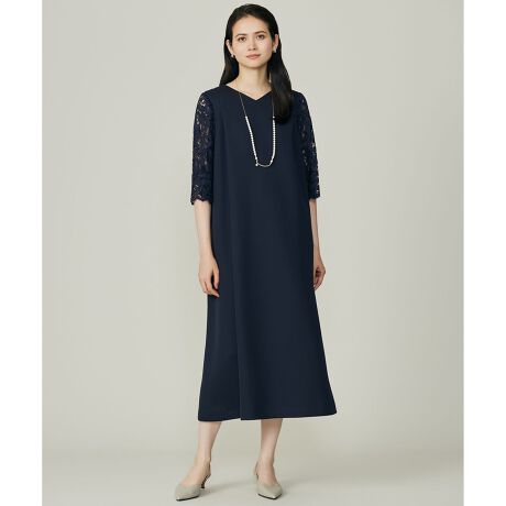 袖のレースが華やかで1枚でサマになるフレアシルエットワンピース■デザイン袖にラッセルレースを使用したフレアシルエットのワンピースです。スカラを施した袖がエレガントで上品な雰囲気が漂うワンピースです。程よく浅めのVネックなので、アクセサリーも合わせて頂きやすいです。様々なシーンに着て頂けるように6分袖で軽く見えるバランス感と、肩から落ちるタックドレープでエレガントなスカートのボリューム感にこだわりお作りしました。1着で凛とした雰囲気になるので、通勤やセレモニーシーン、お食事会などにも活躍します。■素材本体はシルキーなポリエステルを使用しています。二重織で膨らみ感と適度な落ち感が特徴の素材です。水洗い可能でシワが気になりにくいのが嬉しいポイントです。袖のレース部分は、ナチュラル感を表現するためモチーフ部分を綿で構成し、柄際にレーヨンコードを這わせることで、凹凸感を出したデザイン性のあるラッセルレースです。適度な光沢感とハリ感を兼ね備えたのメイドインジャパン素材です。