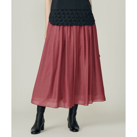 動くたびになびくボリューム感のある華やかなスカート■デザインウエスト周りに細かいプリーツのようなタックを施した、ボリューム感が魅力のシアースカートです。たっぷりと生地を使うことで、動くたびに裾がなびく華やかなデザインになっています。ウエストは総ゴムで快適な着心地ながら、腰回りまでタックを押さえることで、着膨れしにくくすっきり見えが叶う仕様です。天然素材タッチのシアー素材で仕立てることで、様々な素材のトップスと合わせて頂ける活躍の幅が広いスカートです。■素材ポリエステル100%でありながら、綿ローンのようなナチュラル感があるシアー素材です。しなやかなタッチとドレープ性、程よいシアー感で軽やかな印象の素材です。暑い時期から長く着て頂けます。