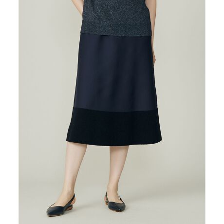 程よくボリュームのあるシルエットとブロッキングが華やかなデザインスカート■デザイン裾に施した質感の異なる素材のブロッキングがアクセントになったフレアシルエットスカートです。ニットならではのしなやかな着心地と、きちんとした華やかな印象を併せ持ったアイテムです。同素材のニット(KRWRGW0358)とセットで着て頂くのもおすすめです。■素材軽量ながらボリューム感があり、しなやかで程よい光沢感が特徴のポリエステル糸を使ったハイゲージニット素材です。素材の持つ微光沢と切り替えに使用している微光沢のあるモール素材が華やかさをプラスしています。■同素材アイテムニット(KRWRGW0358)