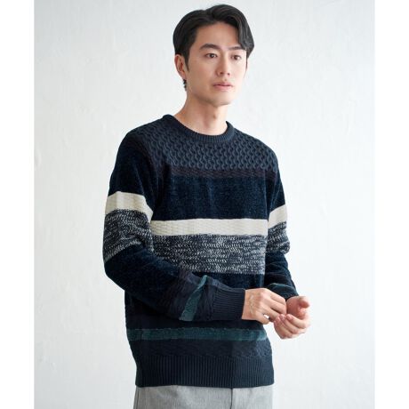 2つの糸を組み合わせた編地変化のボーダーニット。