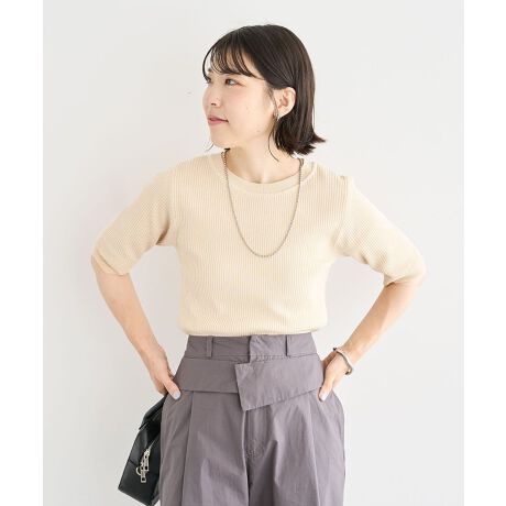 レーヨンベースで仕立てたニットプルオーバー。細畝のリブ仕立てですっきりとした印象に魅せてくれる着心地優しい1枚です。袖先にはシアー素材をジョイントしてレイヤード風のアクセントをプラス。コンパクトな5分丈デザインで羽織りとも相性が良く、ロングシーズン合わせていただけるアイテムです。透け感[なし]