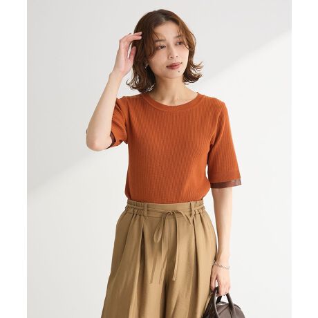 レーヨンベースで仕立てたニットプルオーバー。細畝のリブ仕立てですっきりとした印象に魅せてくれる着心地優しい1枚です。袖先にはシアー素材をジョイントしてレイヤード風のアクセントをプラス。コンパクトな5分丈デザインで羽織りとも相性が良く、ロングシーズン合わせていただけるアイテムです。透け感[なし]