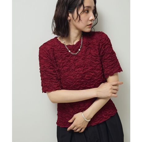 クシュっとした生地が目を惹く五分袖プルオーバー。程よくボディフィットしつつも、伸縮性に優れ快適に着用して頂けます。シンプルなクルーネックボディで着回しやすく、一枚着はもちろんビスチェなどと合わせたレイヤードスタイルにも活躍。表情豊かな素材がスタイリングにアクセントを加えてくれるおすすめのアイテムです。透け感[ややあり]