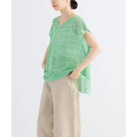 和紙混のドライタッチな糸を使用した清涼感のあるニットトップスは、表面感のあるメランジのメッシュ編みがシンプルなアイテム合わせでもスタイリングに表情が生まれるアイテム。