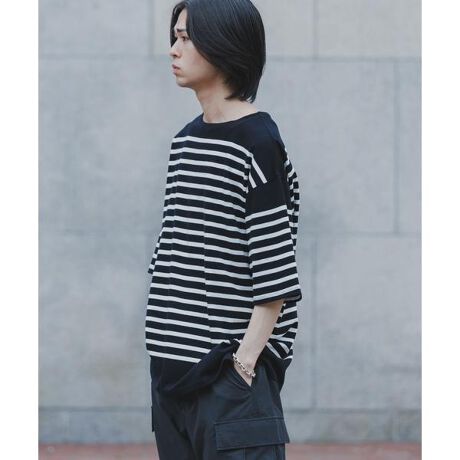 パネルボーダーがモダンなバスク型TEE。タフでハリのあるUSAコットンで肌にへばりつかないサイズ感がファッショナブル且つ実用的な1着。定番ボーダー3色に落ち着きのあるソリッド3色を加えた最旬のカラバリ。ボーダー欲がまだまだ収まらない今、必ず手に入れたい。