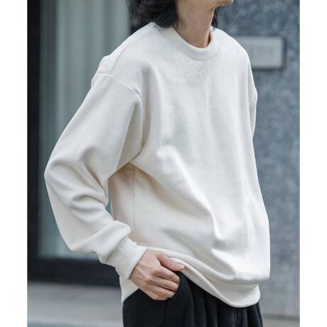 表面にはニットコーデュロイ、裏面には保温性のあるhリース素材を使用したボンディング素材。ポリエステル特有の優れた速乾性も兼備しました。上品な光沢と、ジャストルーズな大人シルエットがマルチでファッショナブルな1着に仕上がりました。