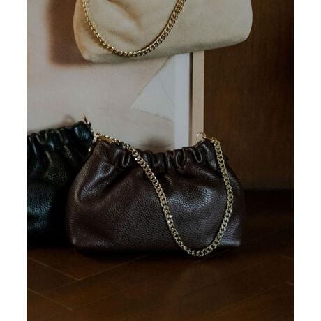 上品な雰囲気漂う柔らかなレザーを使用した、ギャザーデザインとゴールドのチェーンが特徴的なバッグ。