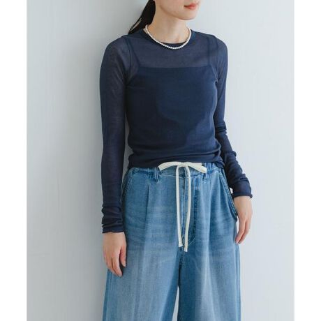 ワードローブに加えておきたいシアーカットソーは、シンプルながらも裾と袖口に施した配色ステッチがアクセントに。