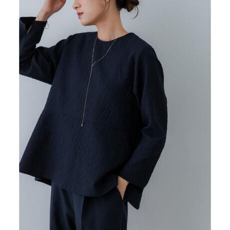 表面にふくらみのあるジャガード素材に、トレンドのペプラムデザインが目を惹くブラウス。
