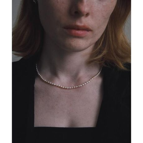 シンプルなデザインで程よい大きさのパールネックレスは、単品使いもチェーンとの重ね付けもおすすめ。