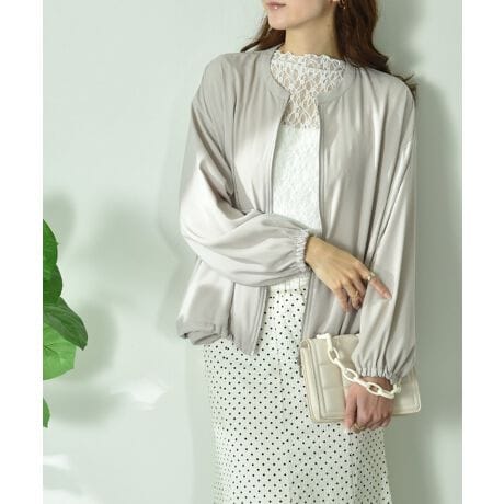上品な光沢とドレープ感が魅力のダブルクロス素材。絶妙な表面感が美しく、カジュアルなアイテムの中に大人の余裕を感じさせてくれます。シワになりにくくさらりとした風合いも嬉しいポイントです。裏地がないことでシャツ感覚で羽織れる軽さも◎さらりと肩の力を抜いて着られるブルゾンです。ノーカラーでスッキリしたデザインに裾と袖口にゴムを使用し、シンプルな中にも女性らしさが漂う1枚。