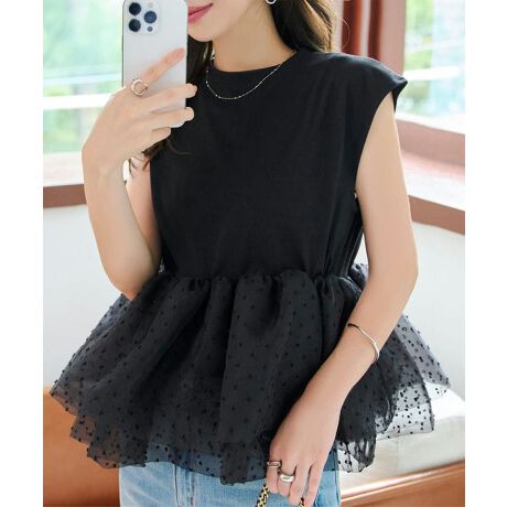 裾に向かって広がるオーガンジー切替が、腰まわりをふんわり包み込み、体型を自然にカバーしながらスタイルアップも叶えてくれる一枚です。